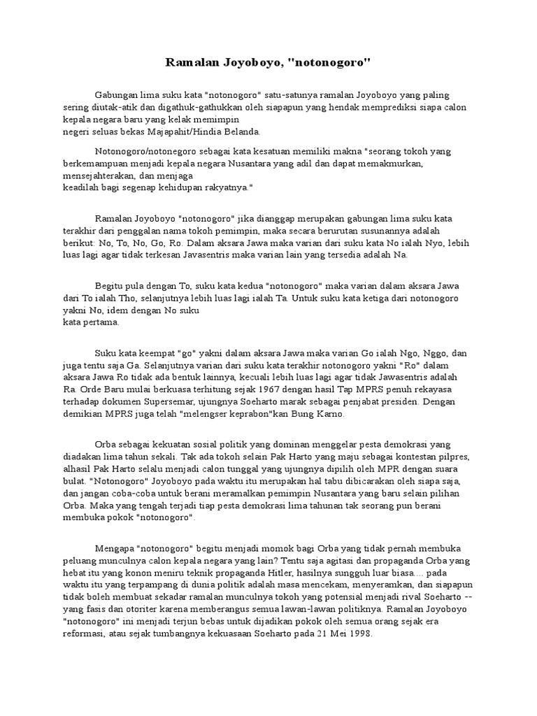 Utamakan baca yang di bold Gabungan lima suku kata notonogoro satu-satunya ramalan Joyoboyo yang paling sering diutak-atik dan digathuk-gathukkan oleh siapapun yang hendak memprediksi siapa calon kepala negara baru yang kelak memimpin negeri seluas bekas MajapahitHindia Belanda. Baca Selengkapnya Misteri Presiden Ke-7 Republik Indonesia Menurut Ramalan Jayabaya Berita Lainnya. Tak Banyak yang Tahu Ternyata Deretan Negara Ini Warganya Sempat Gunakan.